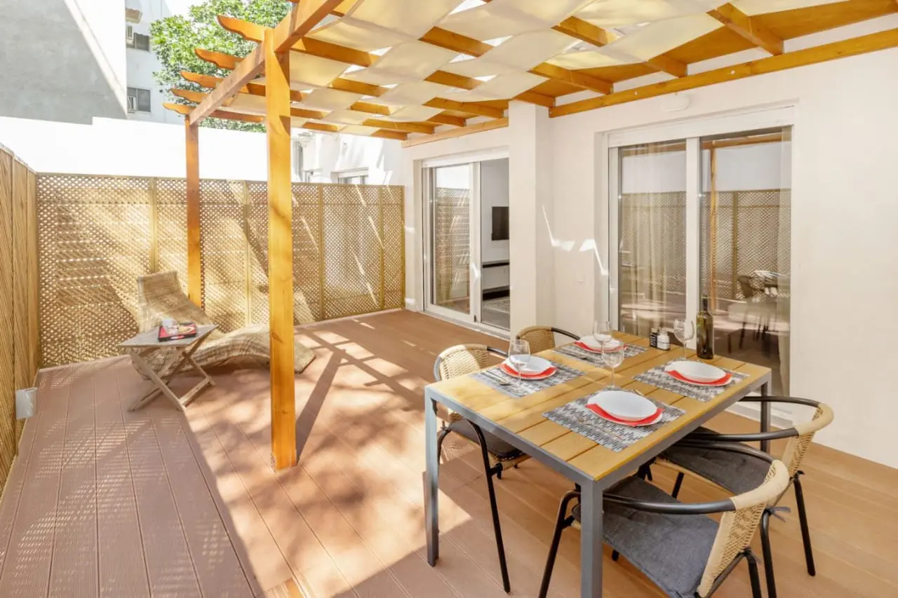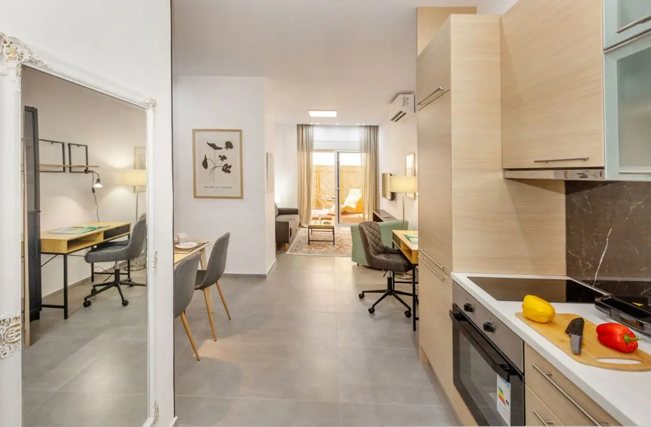 شقة مفروشة بالكامل بمساحة 49 مترًا مربعًا مع فناء خاص في نيوس كوزموس، على بُعد 250 مترًا فقط من المترو. تصنيف الطاقة B+، تصريح Airbnb، لتحقيق دخل إيجار قوي.