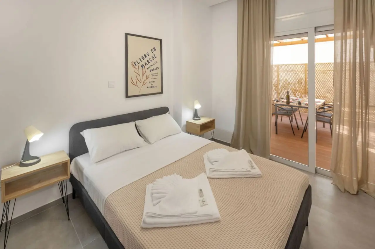 تضم الشقة غرفة معيشة مشرقة مع مطبخ عصري أنيق، وغرفة نوم واحدة، وحمامًا واحدًا. ومن أبرز ما يميزها فناء خاص مُصمم بشكل جميل بمساحة 26 مترًا مربعًا، يتميز بأرضيات خشبية مُغطاة، وشرفة خشبية مُغطاة، ومنطقة طعام خارجية مريحة، مثالية للاستمتاع بمناخ اليونان المعتدل على مدار العام.