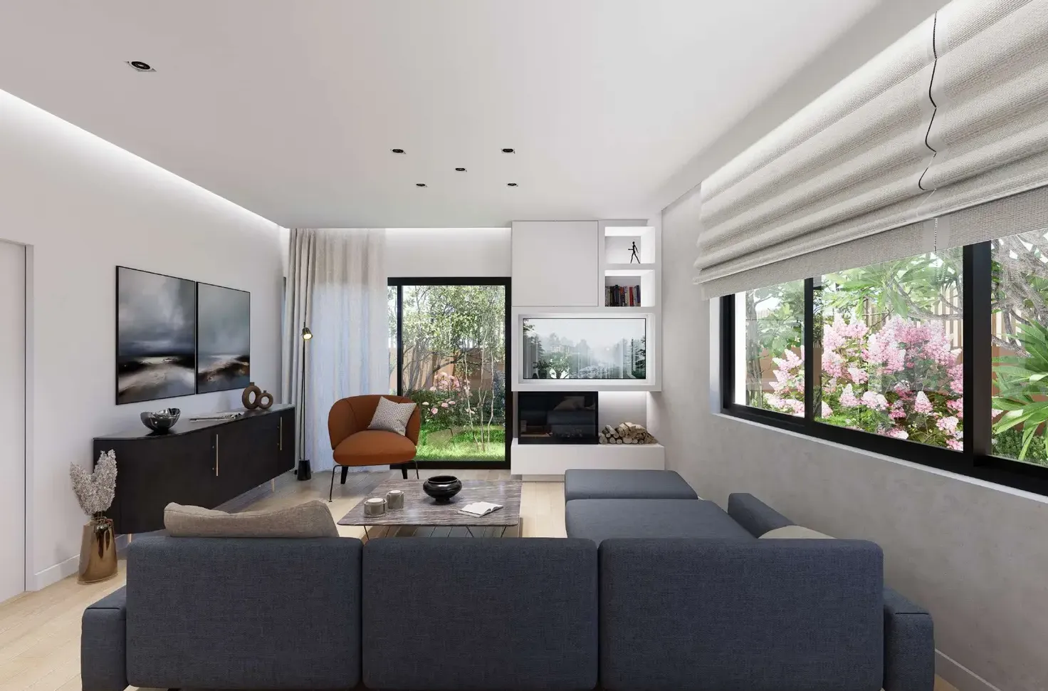 A charming 135.10 m² residence spanning two levels. The ground floor offers a spacious living room with fireplace, open-plan kitchen, one bedroom, and direct garden access. The lower level includes two bright bedrooms, a bathroom, kitchenette, and storage.