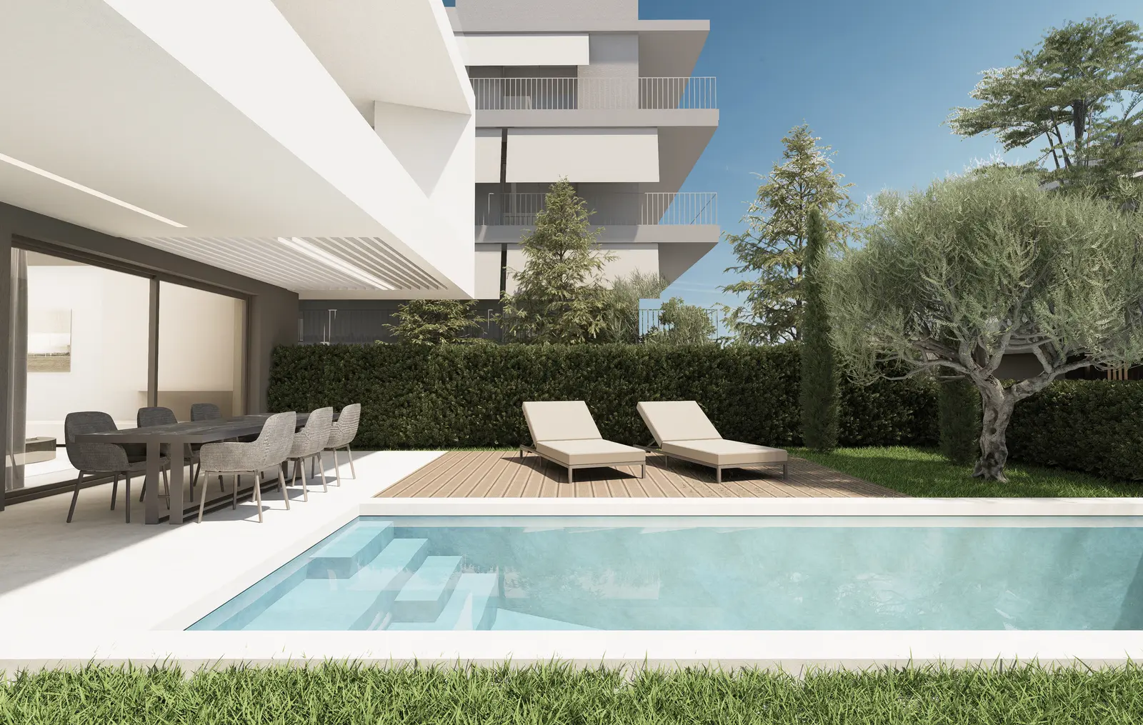 High-quality materials such as oak wooden floors, thermal aluminum frames with low-e glazing, and designer ceramic tiles complement the modern architecture and ensure both comfort and durability.