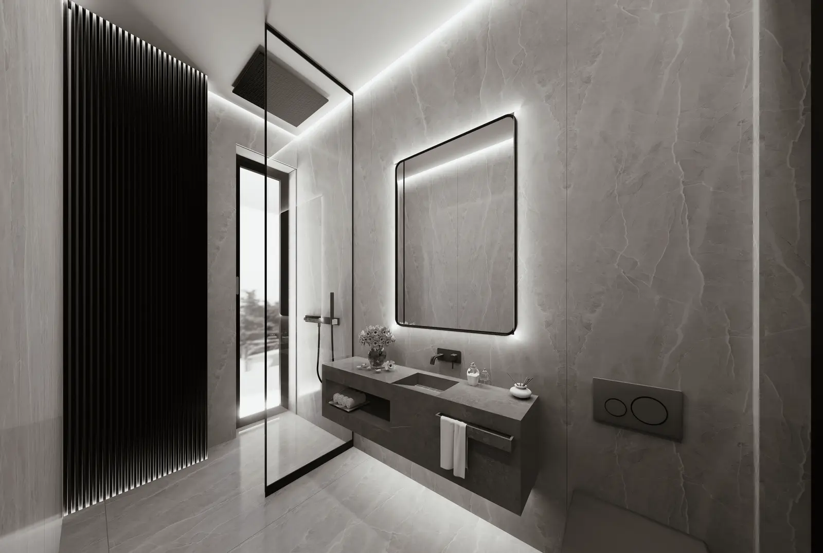 The ground floor (86 m²) features a spacious living room, dining area, open-plan kitchen, guest WC, and private elevator. The first floor (61 m²) hosts two elegant master bedrooms, each with its own bathroom, and offers the flexibility to create a third bedroom if desired.