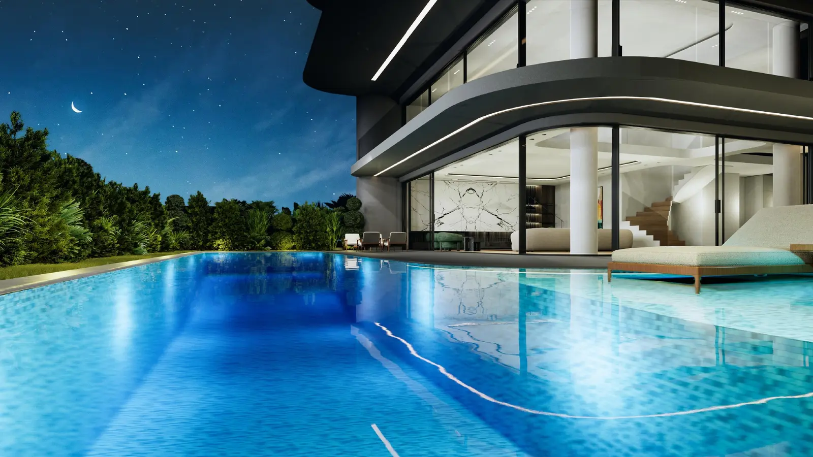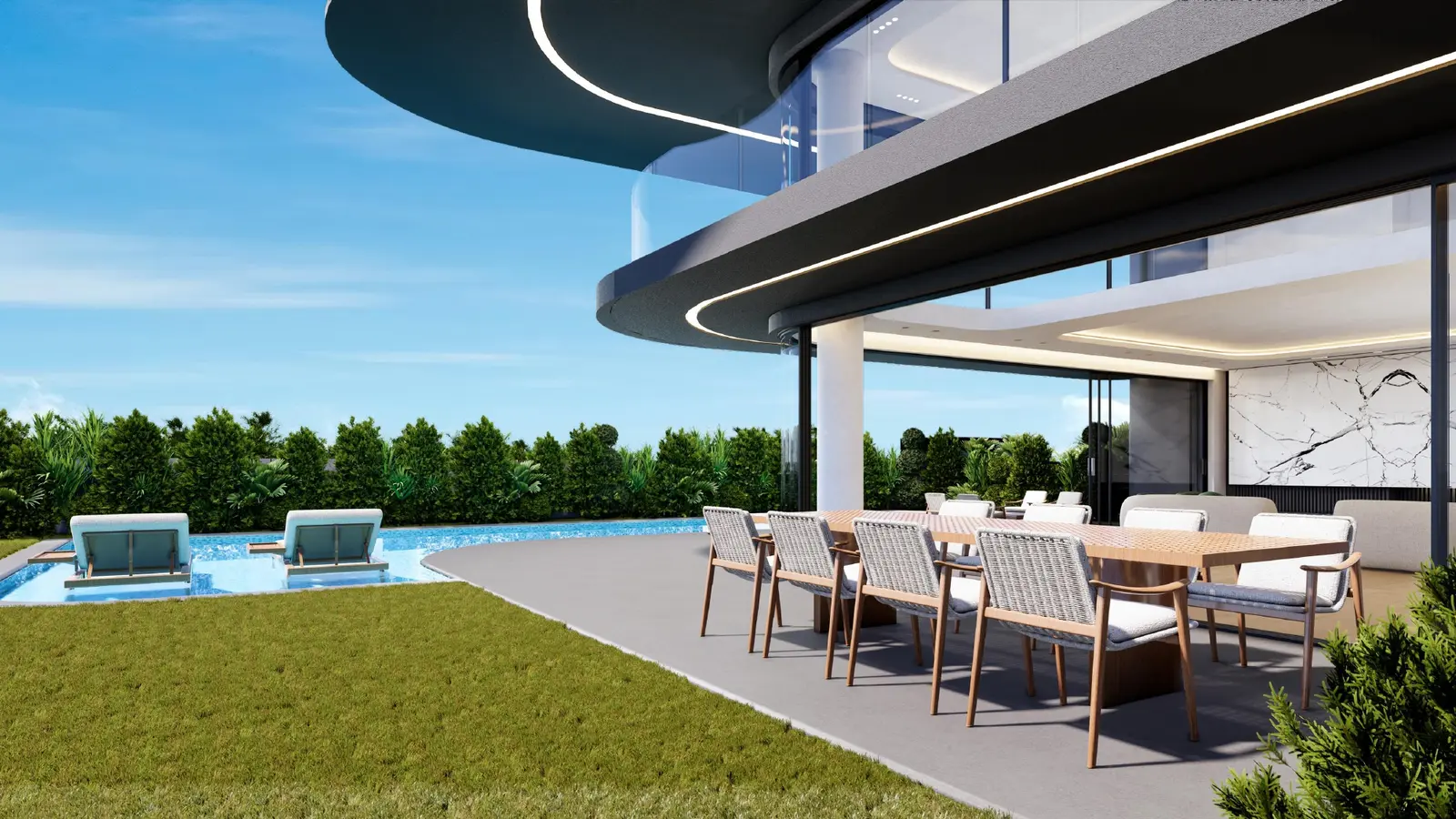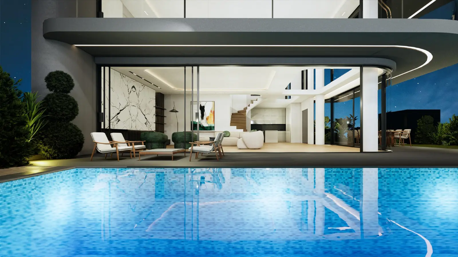 The ground floor (171 m²) is designed for everyday living and entertaining, with a generously sized living and dining area, an open-plan kitchen with modern amenities, and a spacious master suite with en-suite bathroom. Floor-to-ceiling glass floods the interiors with natural light and opens directly to the garden and pool area.