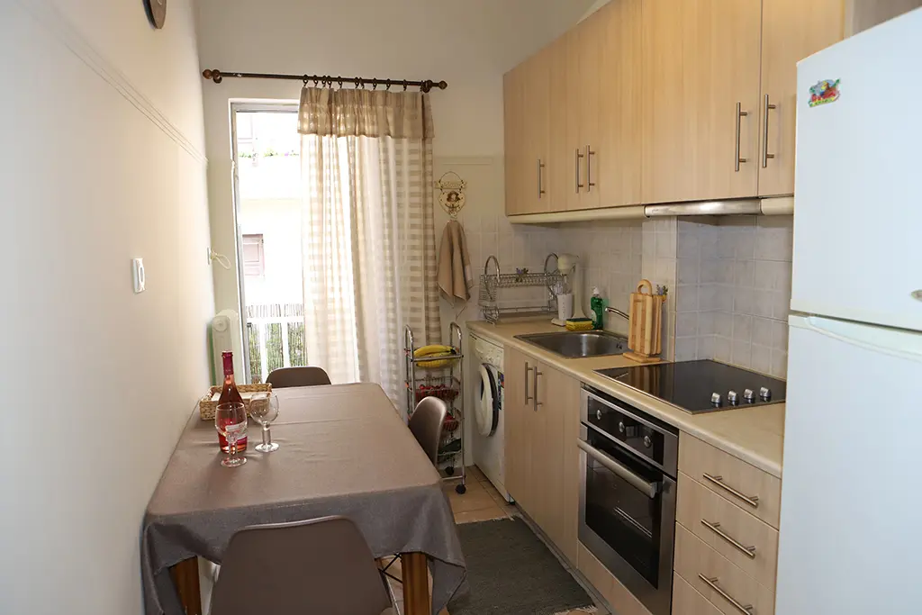 Set on the mezzanine level of a well-maintained two-story building, the apartment offers a bright, corner layout with tranquil views of surrounding greenery. It includes one bedroom, a comfortable living room, a fully equipped kitchen, a modern bathroom, and a welcoming hall that leads to a cozy terrace. Every detail has been thoughtfully updated during the 2024 renovation, combining modern comfort with timeless Athenian charm.