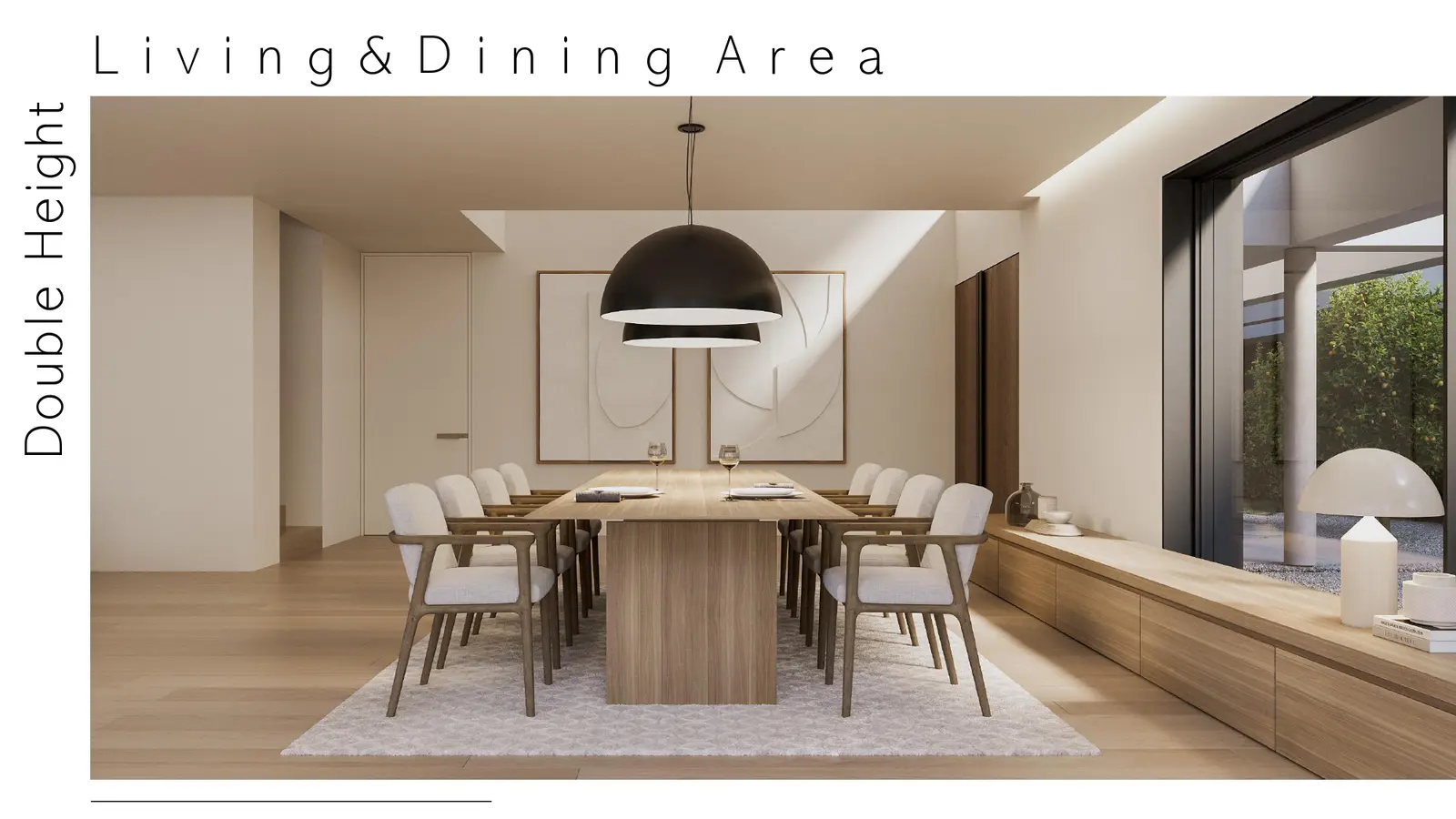 - En soldränkt dubbelhöjd vardagsrums- och matplats